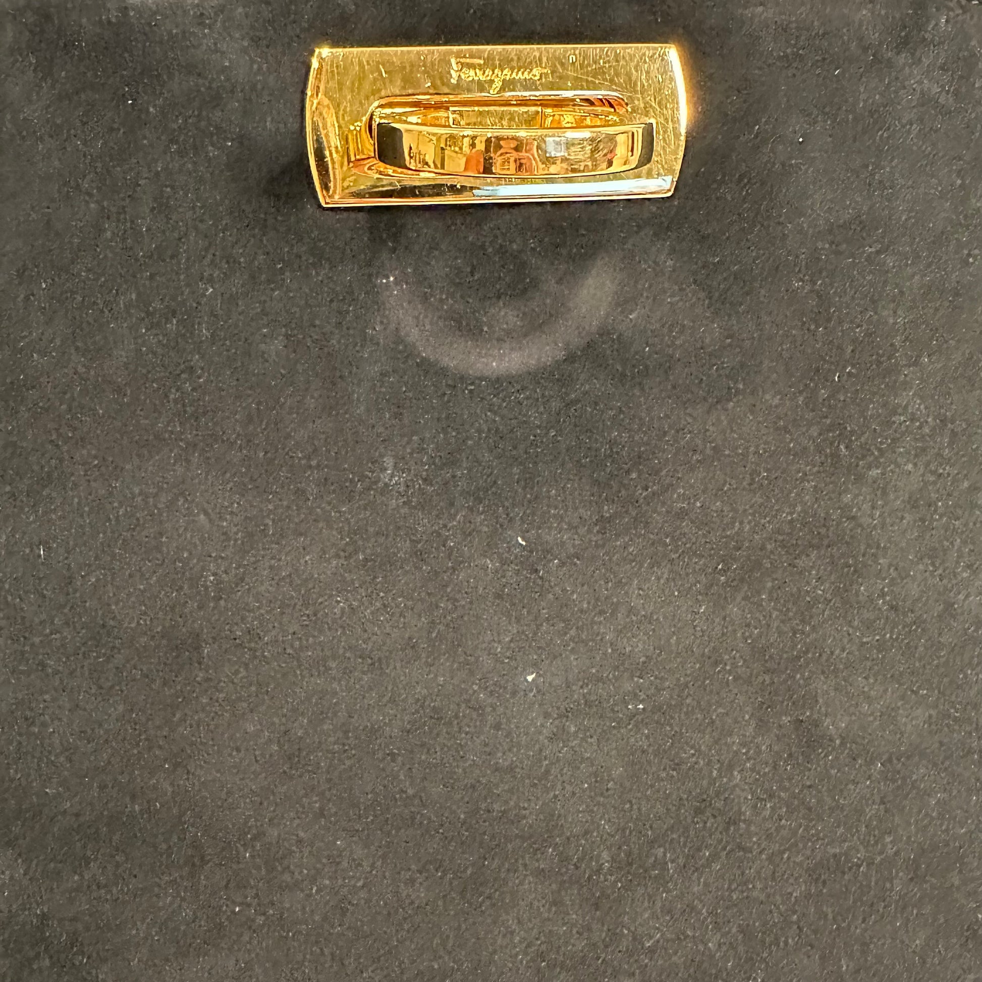 Condition: Very Good vintage condition with minimal signs of wear. The suede exterior is soft and richly hued, showing minimal signs of age. The gold-tone hardware/ring clasp shines beautifully, but it has left markings on the suede (see photo). The interior, however, remains clean and well-kept. A sophisticated statement piece that perfectly embodies Ferragamo’s timeless elegance and refined Italian craftsmanship.